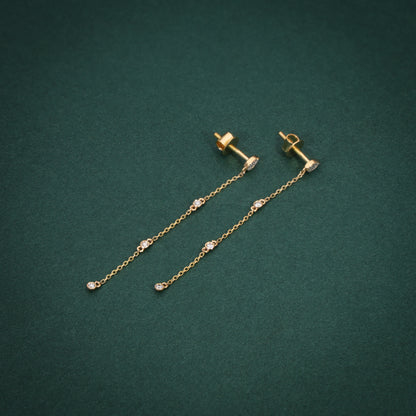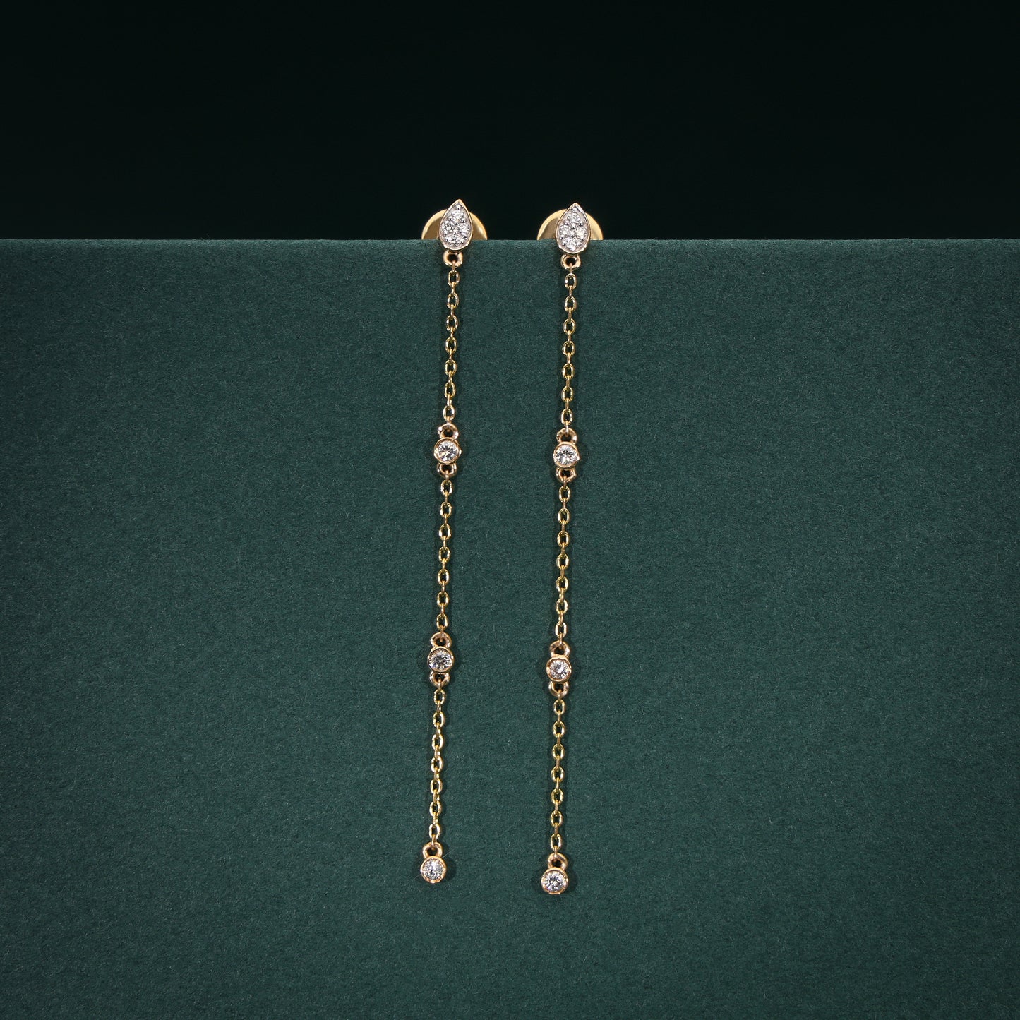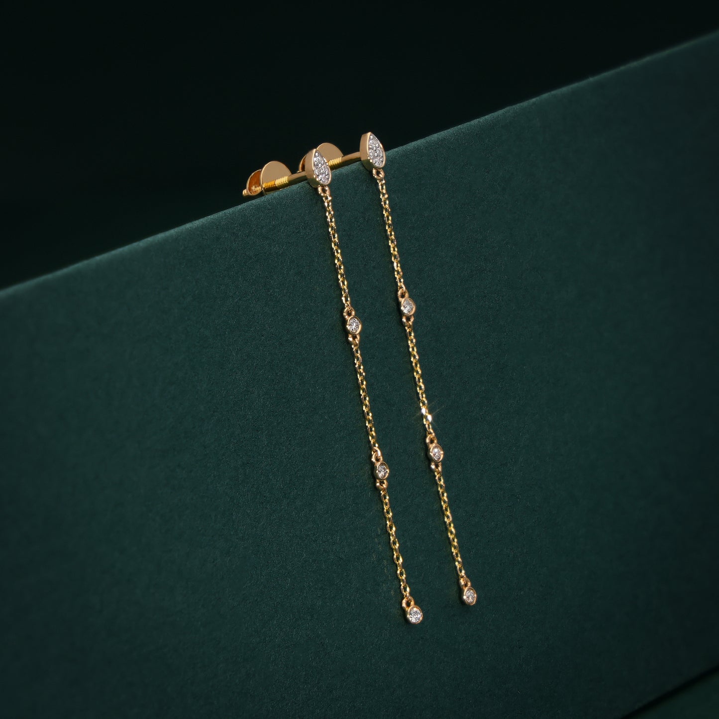 The Glimmering Threads Earrings combine elegance and movement. Featuring a long, slender drop with delicate diamond accents, these earrings add a soft, sparkling touch to your look. The flowing design catches the light beautifully, giving them an ethereal and timeless appeal.