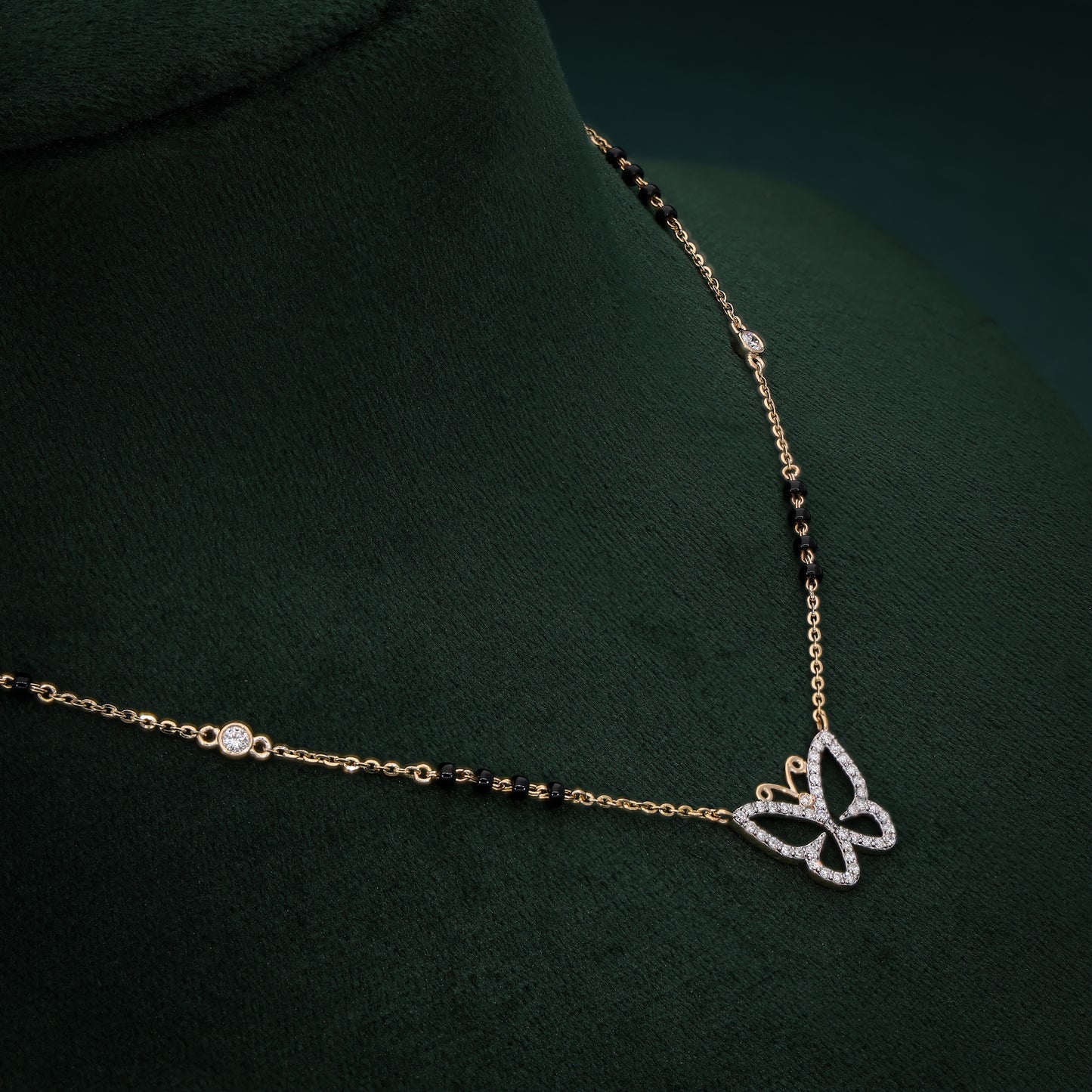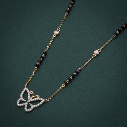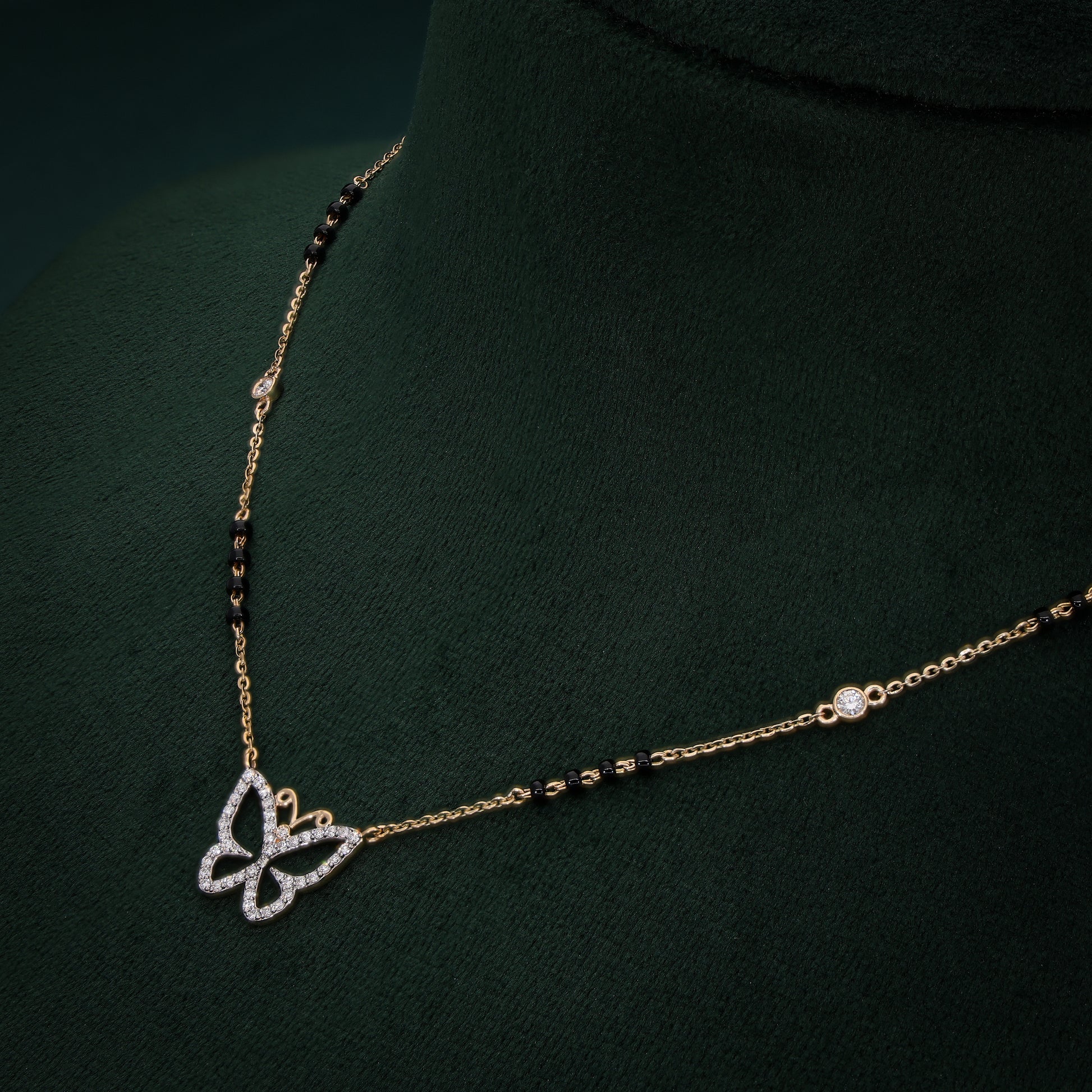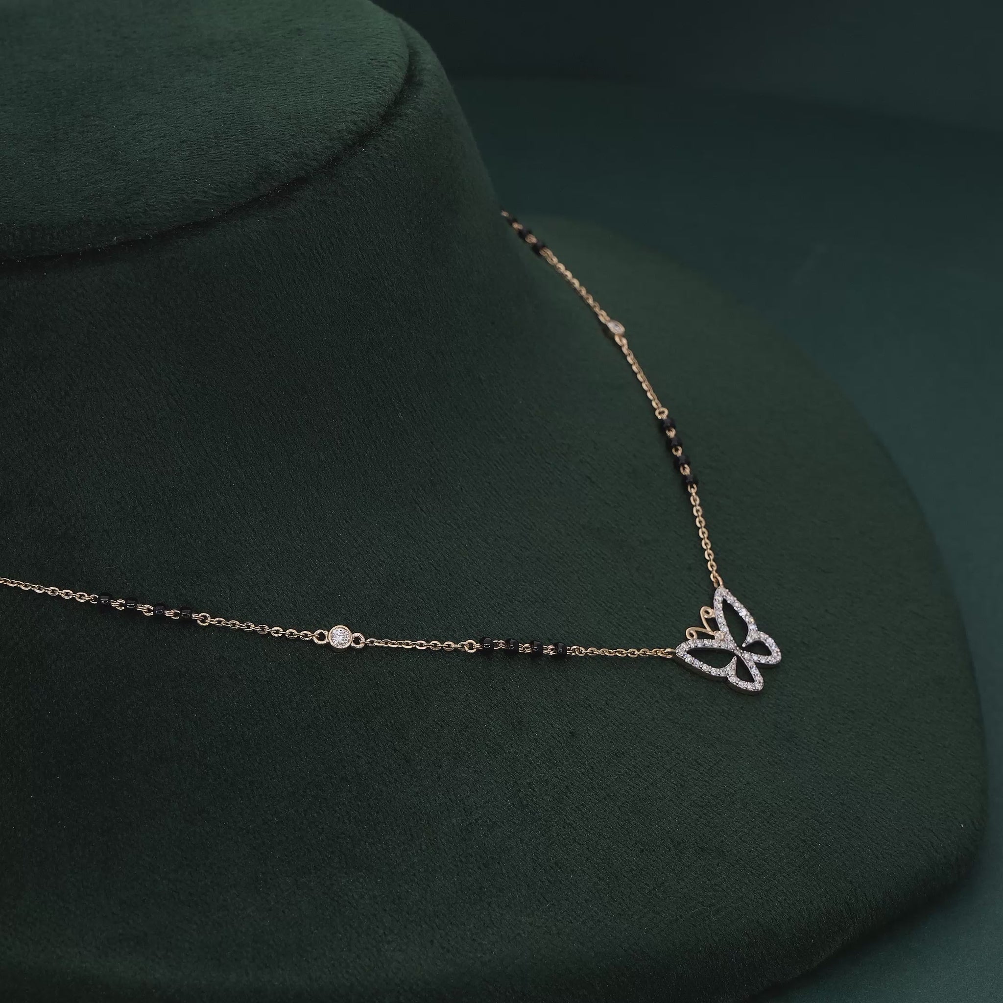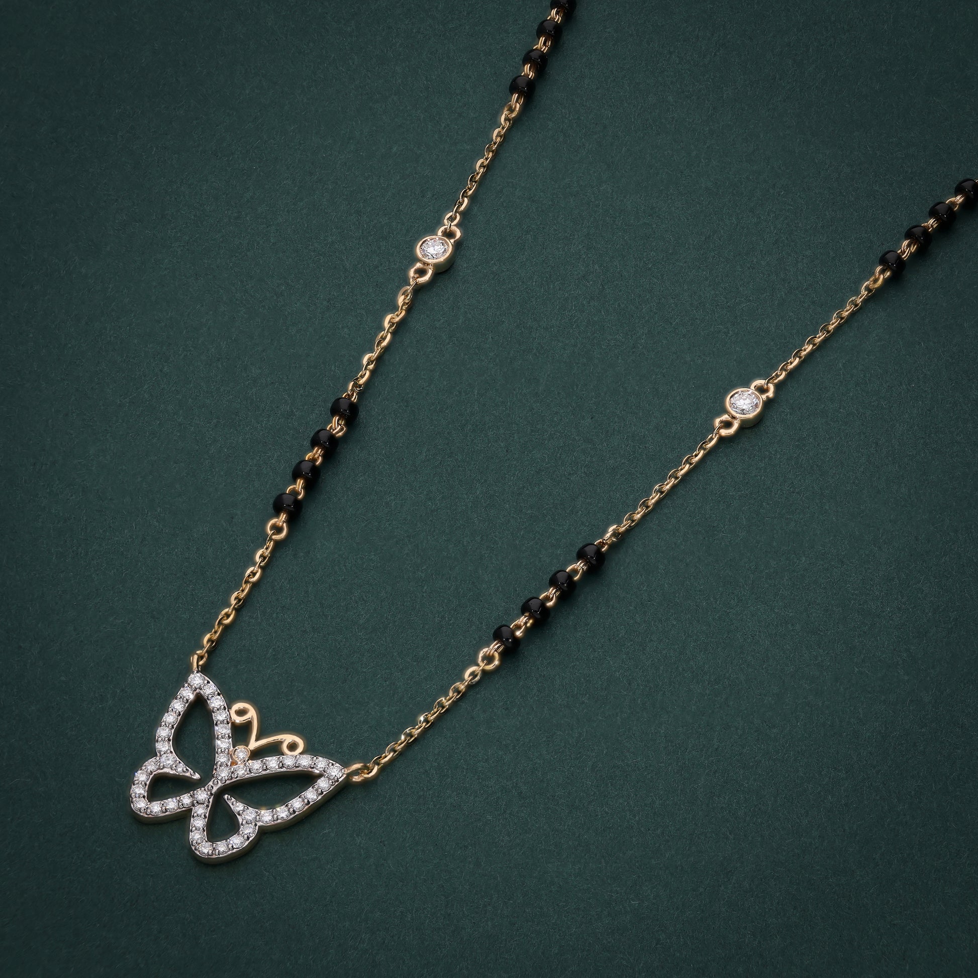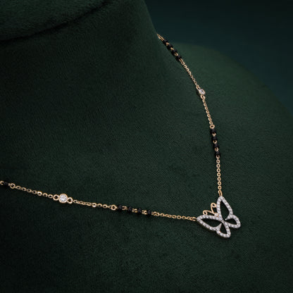 This whimsical 18K gold mangalsutra features a dazzling butterfly pendant encrusted with lab-grown diamonds, symbolizing transformation and beauty. The delicate gold chain, adorned with traditional black beads and bezel-set diamond accents, offers a perfect blend of modern elegance and cultural heritage. Lightweight and versatile, this mangalsutra is ideal for daily wear or special occasions, making it a meaningful piece for the modern bride who cherishes tradition with a contemporary twist. Crafted with sustainable diamonds, it embodies luxury and eco-conscious craftsmanship.