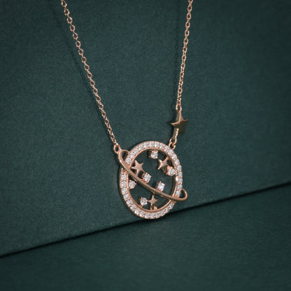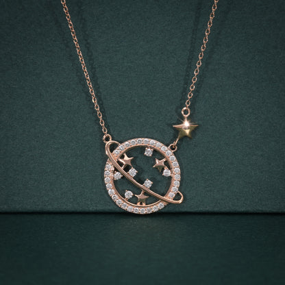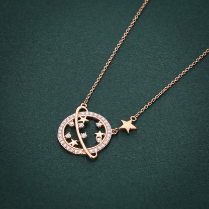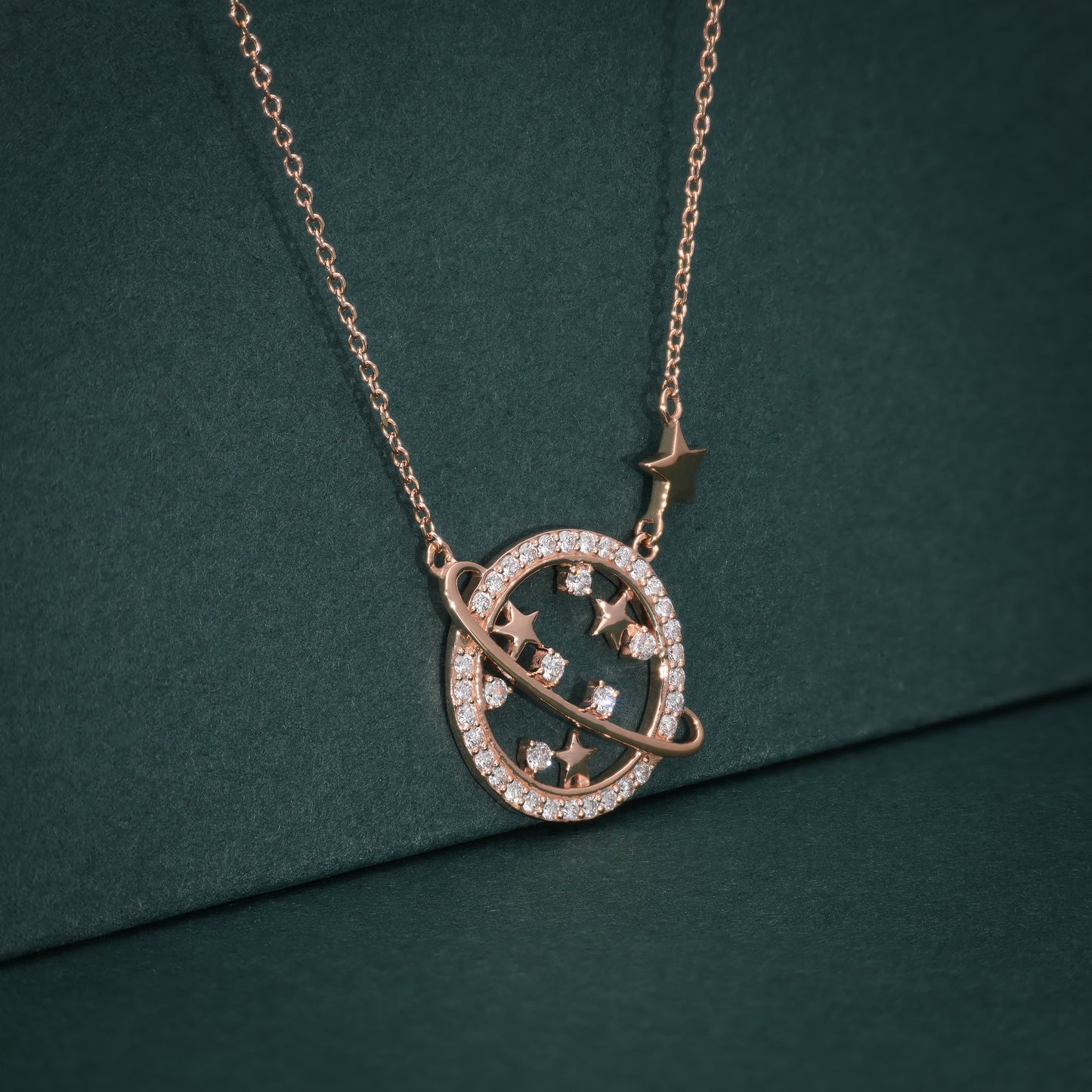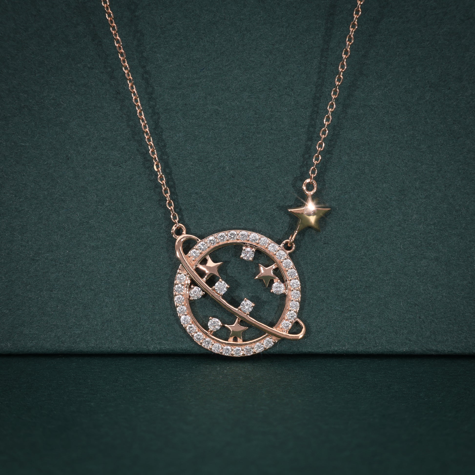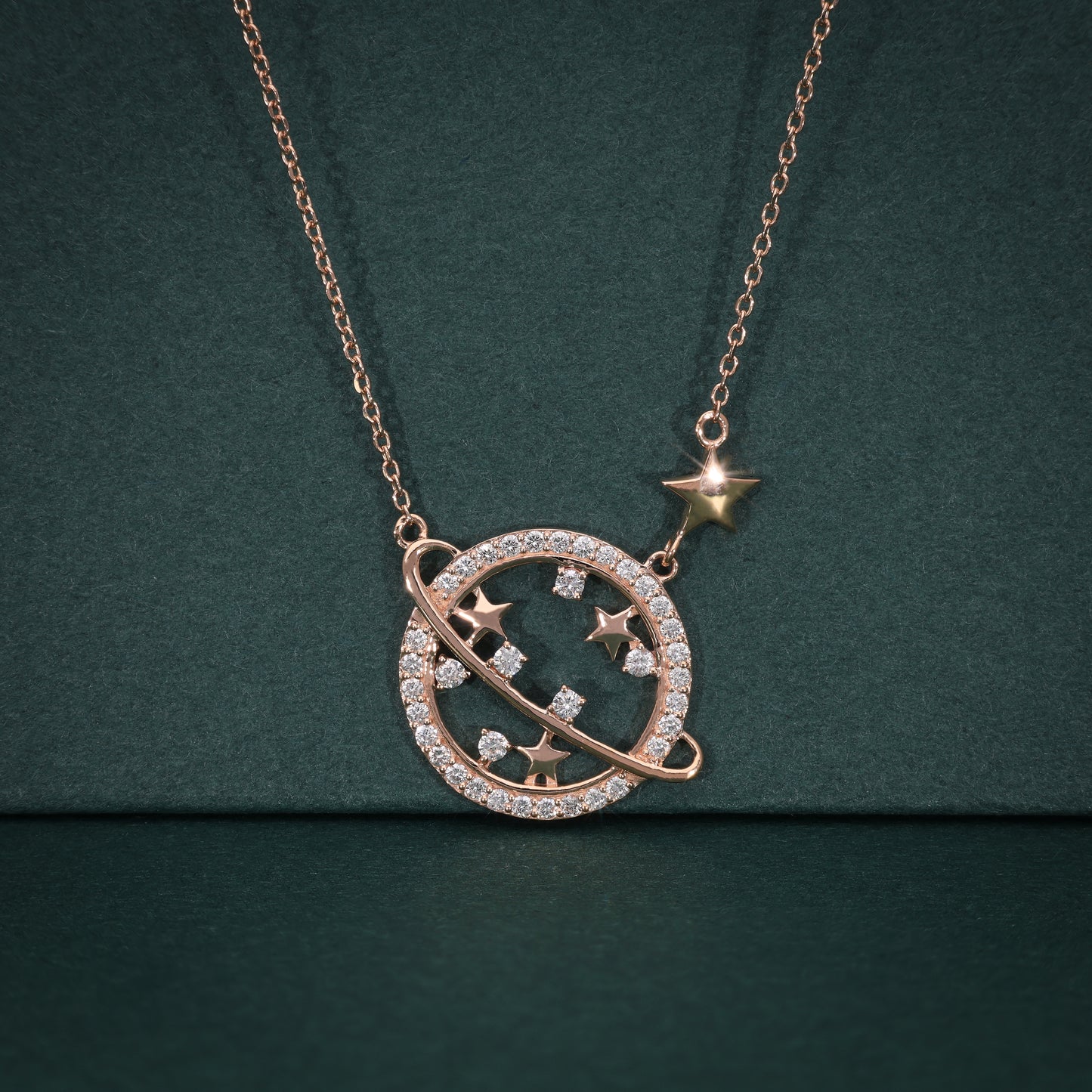 Embrace the allure of the cosmos with the Ethereal Galaxy Necklace, a mesmerizing piece that captures the beauty of the night sky. Crafted in lustrous rose gold, the circular pendant features a sparkling ring adorned with brilliant diamonds, orbiting around a constellation of star motifs.