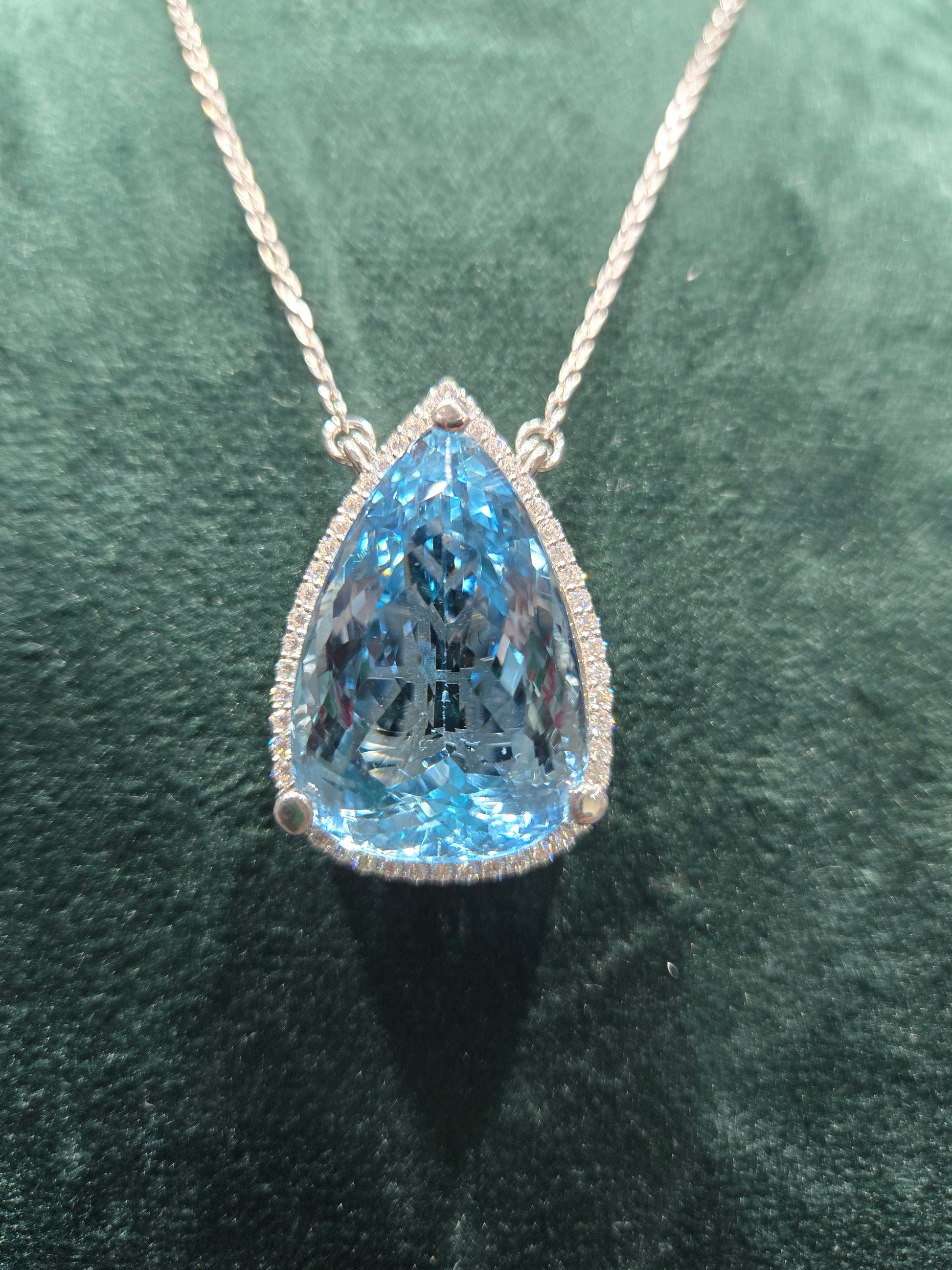 Make a statement with this breathtaking pear-cut blue topaz pendant, exuding a serene and captivating brilliance. The vibrant sky-blue gemstone is encased in a shimmering halo of accent stones, enhancing its radiant sparkle. Suspended from a sleek sterling silver chain, this timeless piece adds sophistication and charm to any jewelry collection. Perfect for special occasions or everyday elegance.