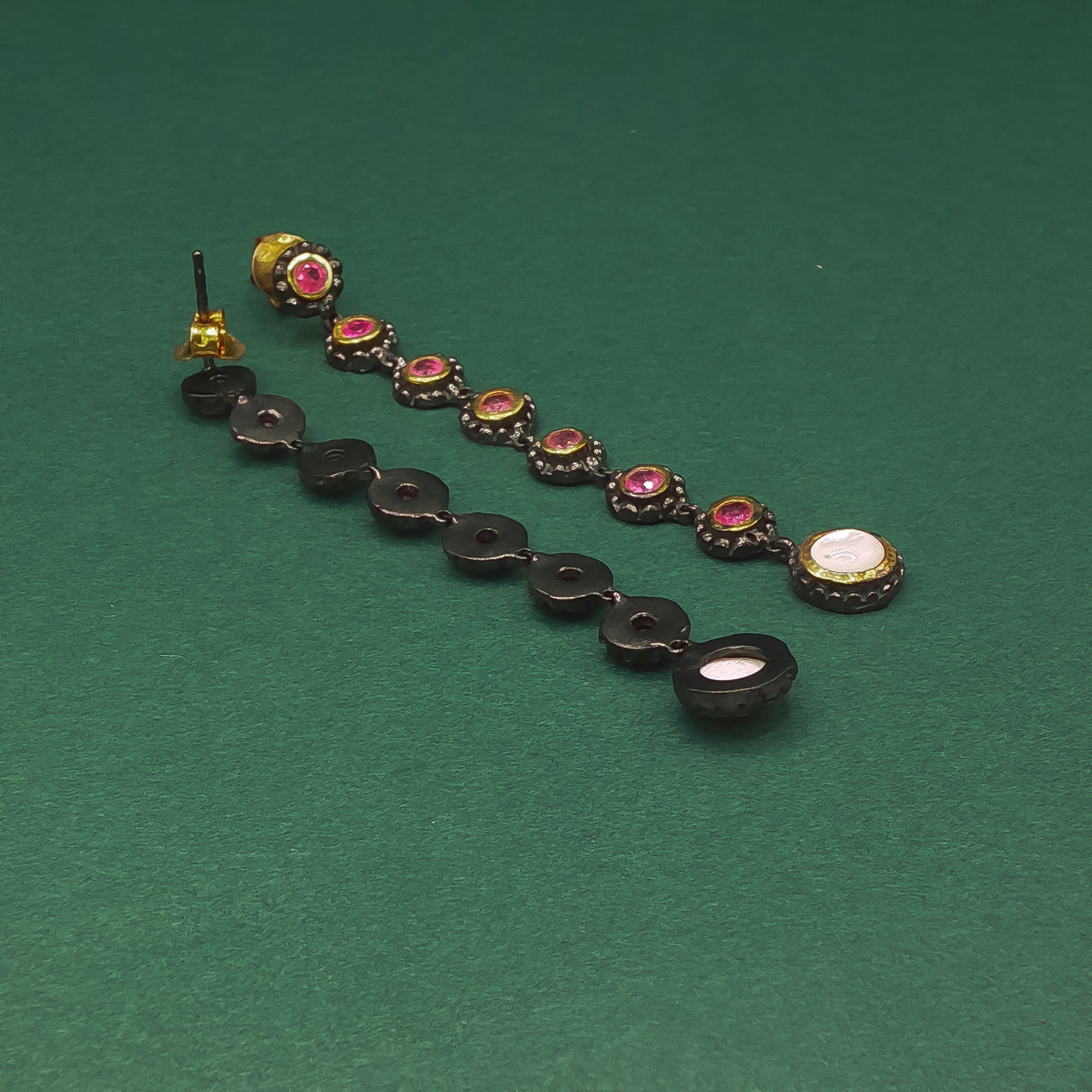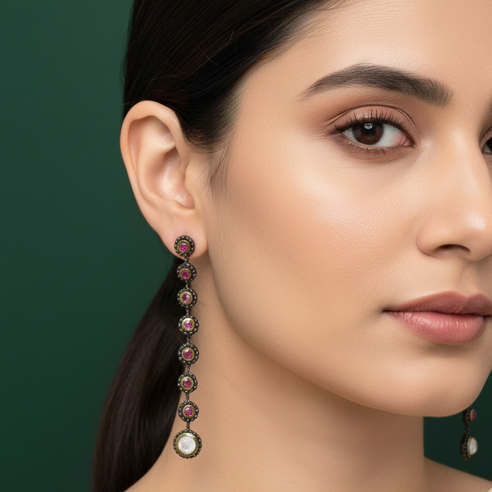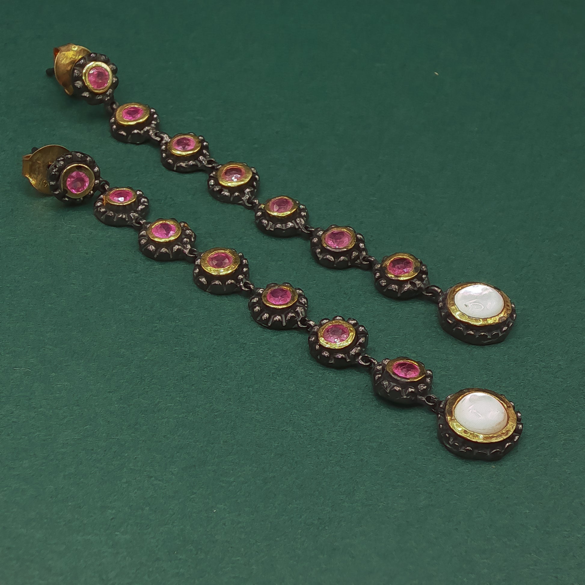 Elevate your style with these elegant silver dangle earrings. Featuring round cabochon-cut red rubies, each gemstone exudes a captivating glow. Their unique composition and meticulous arrangement create a striking, sophisticated accessory.