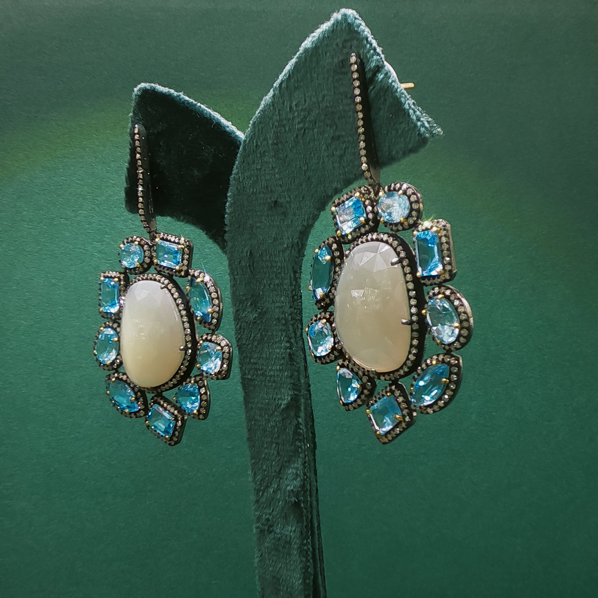 Enhance your look with these exquisite silver dangle earrings. Each earring showcases a luminous cabochon oval topaz with a mesmerizing blue hue. These earrings epitomize elegance and add a touch of sophistication to any ensemble, perfect for those who appreciate refined jewelry.