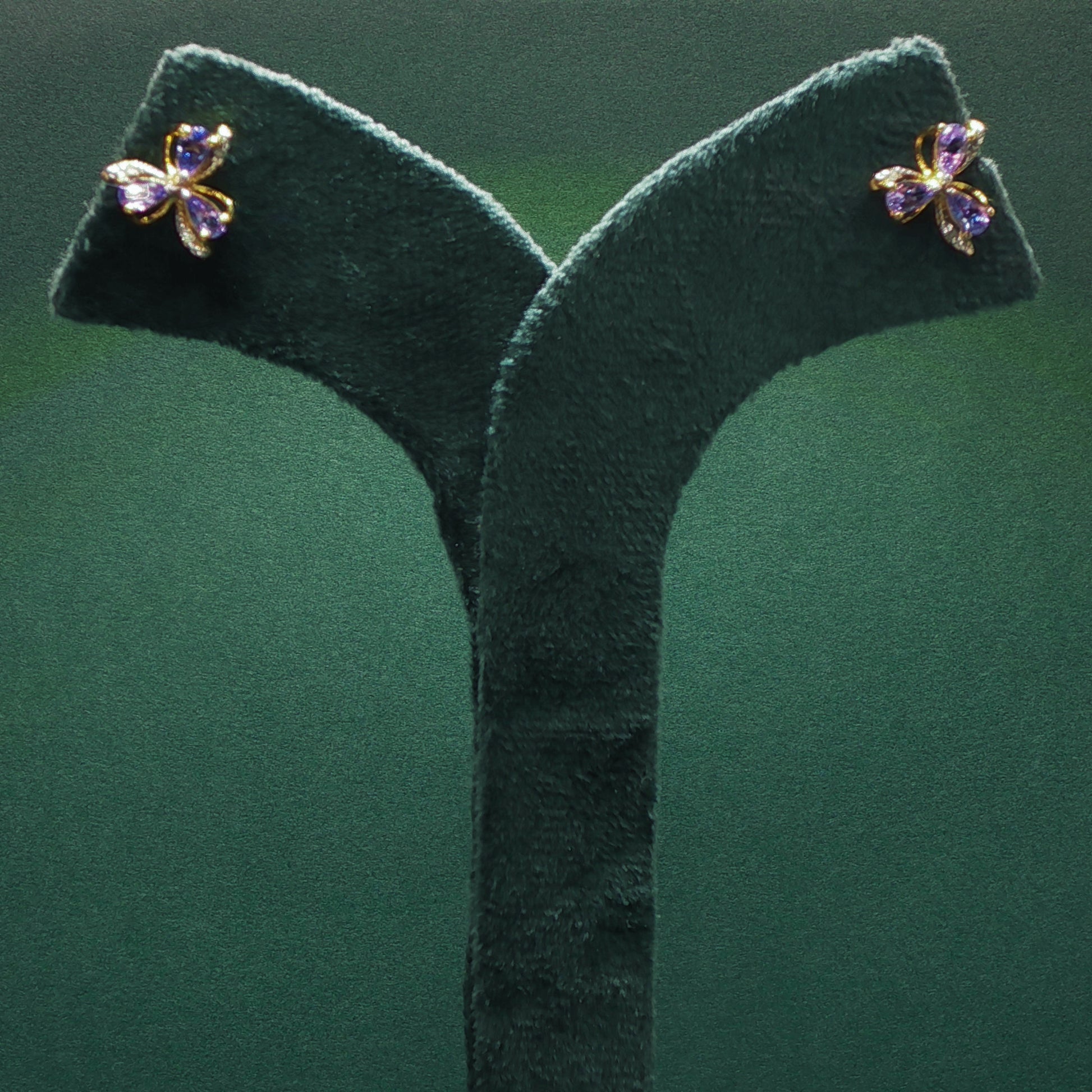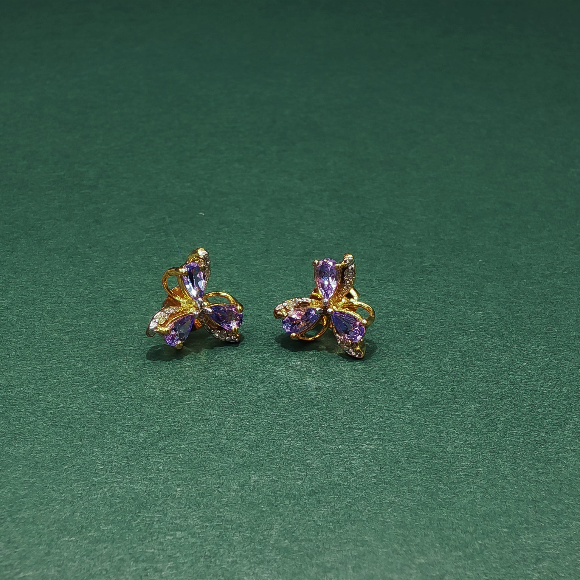 Elevate your style with these charming gold stud earrings. Each earring showcases a trio of pear-shaped amethysts, displaying a vibrant purple hue. The gemstones feature a mixed cut to enhance their brilliance, offering a delightful touch of color and sophistication.