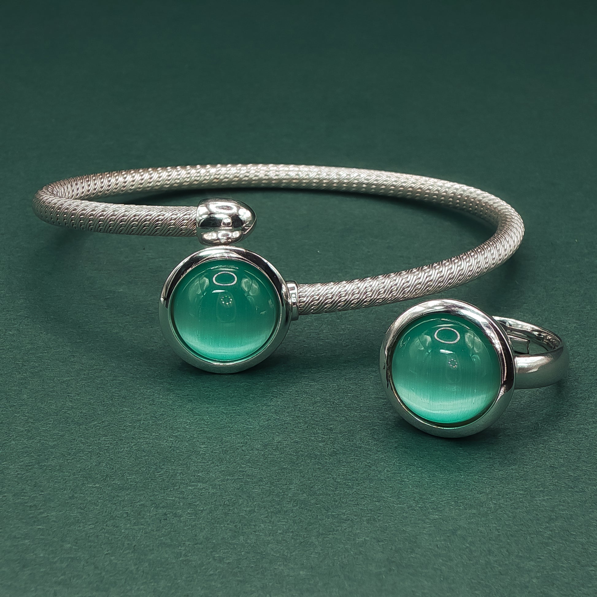 Embrace celestial allure with this elegant silver bangle. Its fluid design culminates in captivating bluish green Catseye cabochons, exuding a mystical glow. This stunning piece seamlessly blends contemporary style with classic gemstone charm, perfect for adding a touch of understated sophistication to any ensemble.